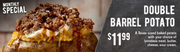 A Texas-sized baked potato with your choice of boneless meat, butter, cheese, sour cream